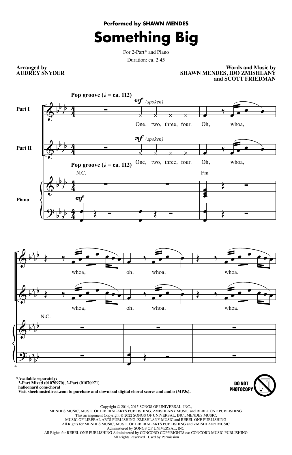 Download or print Shawn Mendes Something Big (arr. Audrey Snyder) sheet music, chords and digital score arranged for 3-Part Mixed Choir. This Pop score includes 15 page(s).