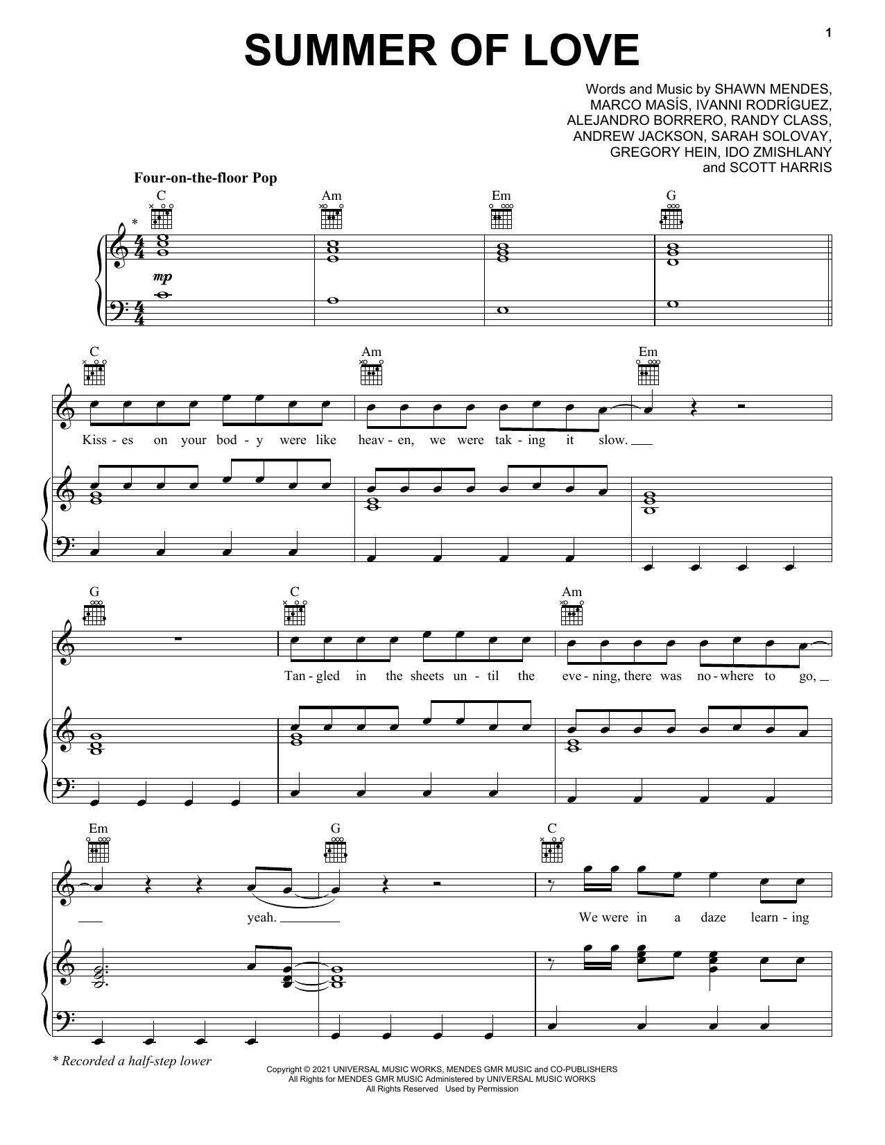 Download or print Shawn Mendes & Tainy Summer Of Love (feat. Tainy) sheet music, chords and digital score arranged for Piano, Vocal & Guitar Chords (Right-Hand Melody). This Pop score includes 7 page(s).