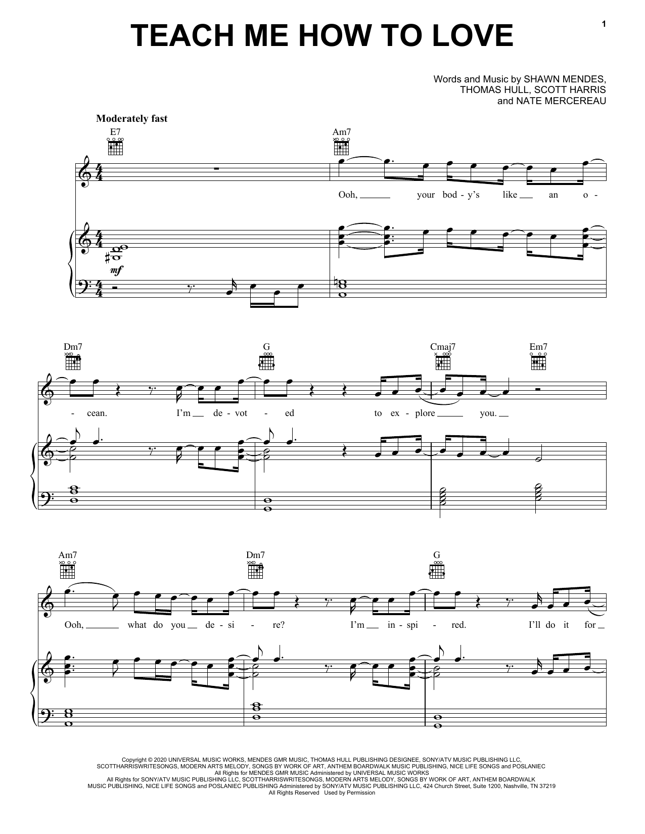 Download or print Shawn Mendes Teach Me How To Love sheet music, chords and digital score arranged for Piano, Vocal & Guitar Chords (Right-Hand Melody). This Pop score includes 8 page(s).