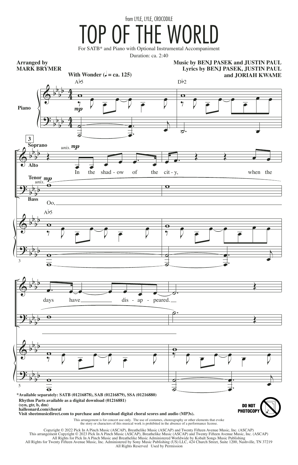 Download or print Shawn Mendes Top Of The World (from Lyle, Lyle, Crocodile) (arr. Mark Brymer) sheet music, chords and digital score arranged for SSA Choir. This Film/TV score includes 9 page(s).
