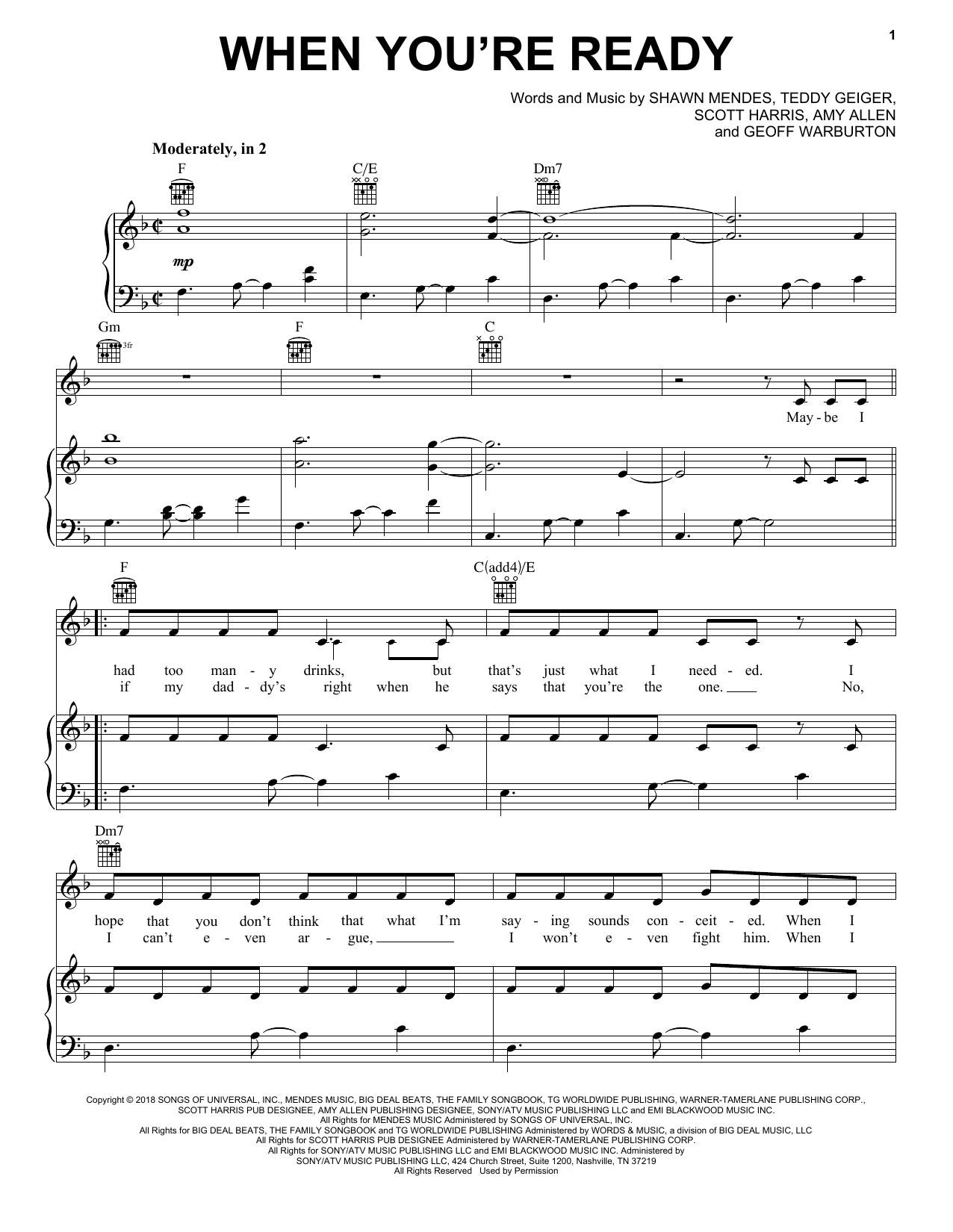 Download or print Shawn Mendes When You're Ready sheet music, chords and digital score arranged for Piano, Vocal & Guitar Chords (Right-Hand Melody). This Pop score includes 6 page(s).