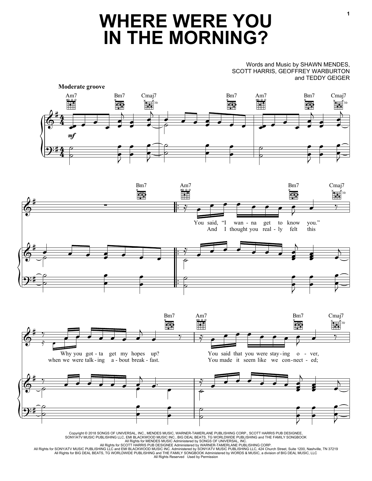 Download or print Shawn Mendes Where Were You In The Morning? sheet music, chords and digital score arranged for Piano, Vocal & Guitar Chords (Right-Hand Melody). This Pop score includes 5 page(s).