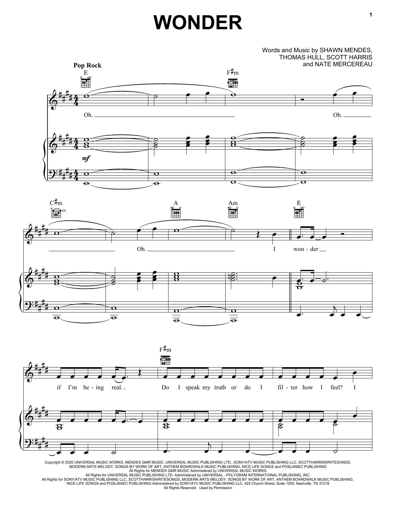 Download or print Shawn Mendes Wonder sheet music, chords and digital score arranged for Easy Piano. This Pop score includes 6 page(s).