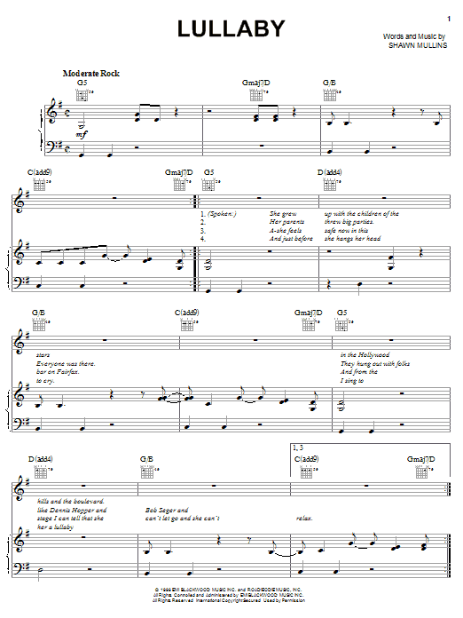 Download or print Shawn Mullins Lullaby sheet music, chords and digital score arranged for Piano, Vocal & Guitar Chords (Right-Hand Melody). This Pop score includes 10 page(s).