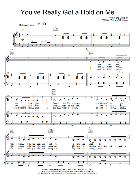 Download or print She & Him You've Really Got A Hold On Me sheet music, chords and digital score arranged for Piano, Vocal & Guitar Chords (Right-Hand Melody). This Love score includes 3 page(s).