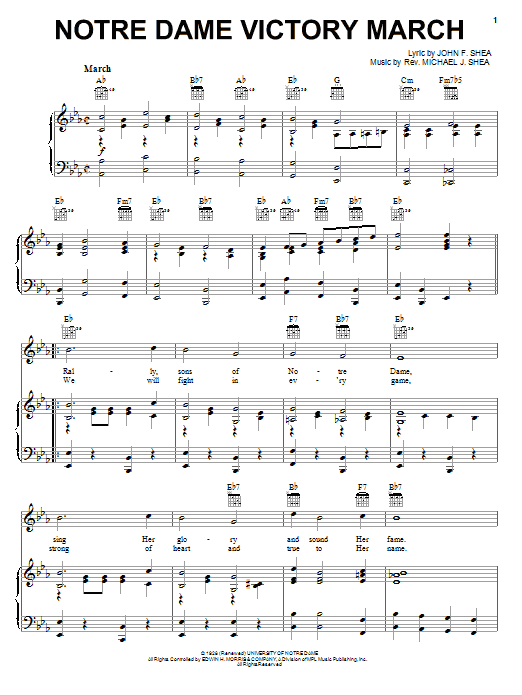 Download or print Shea & Shea Notre Dame Victory March sheet music, chords and digital score arranged for Piano, Vocal & Guitar Chords (Right-Hand Melody). This Standards score includes 4 page(s).