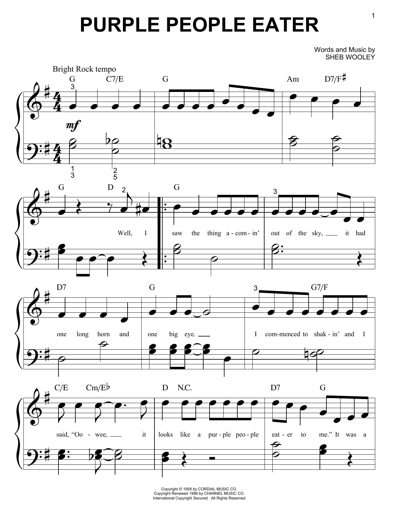 Download or print Sheb Wooley Purple People Eater sheet music, chords and digital score arranged for Piano, Vocal & Guitar Chords (Right-Hand Melody). This Pop score includes 2 page(s).