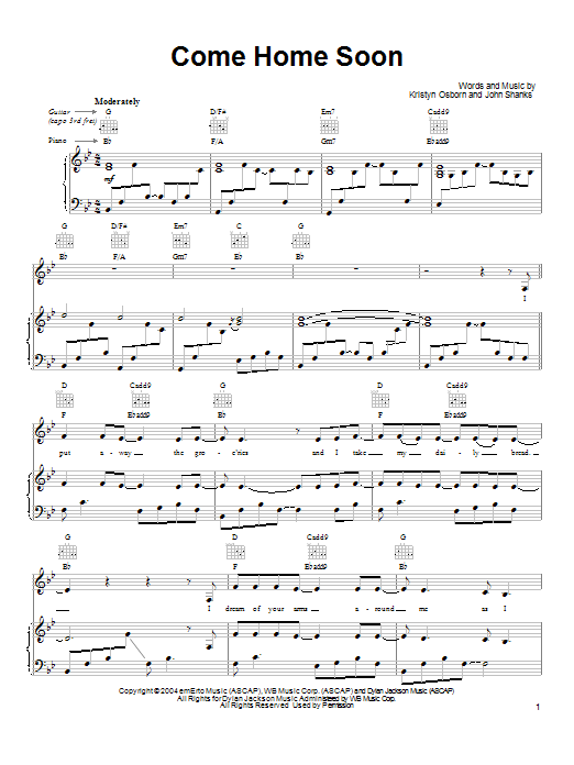 Download or print SHeDAISY Come Home Soon sheet music, chords and digital score arranged for Piano, Vocal & Guitar Chords (Right-Hand Melody). This Pop score includes 5 page(s).