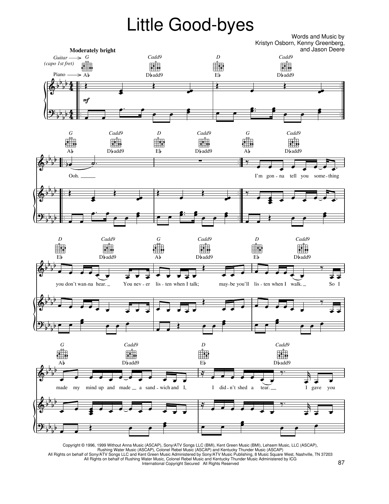 Download or print SHeDAISY Little Good-byes sheet music, chords and digital score arranged for Piano, Vocal & Guitar Chords (Right-Hand Melody). This Pop score includes 7 page(s).
