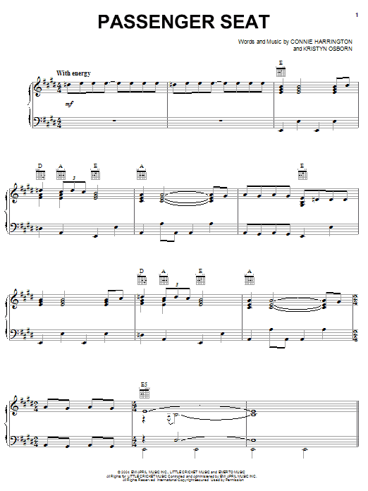 Download or print SHeDAISY Passenger Seat sheet music, chords and digital score arranged for Piano, Vocal & Guitar Chords (Right-Hand Melody). This Country score includes 9 page(s).