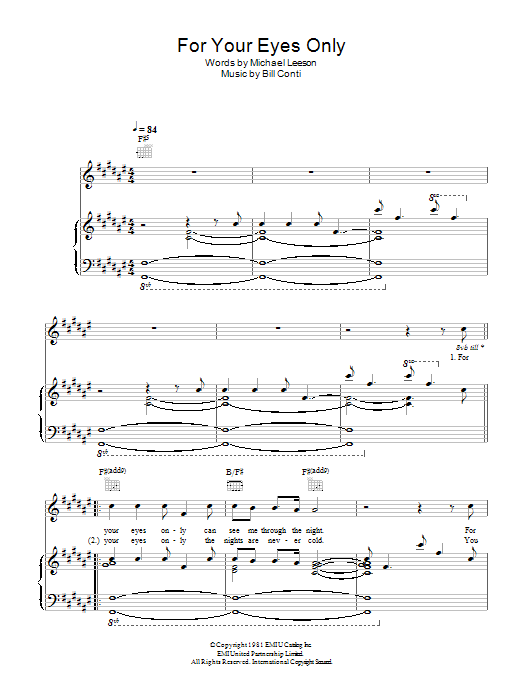 Download or print Sheena Easton For Your Eyes Only sheet music, chords and digital score arranged for Piano, Vocal & Guitar Chords. This Film/TV score includes 4 page(s).