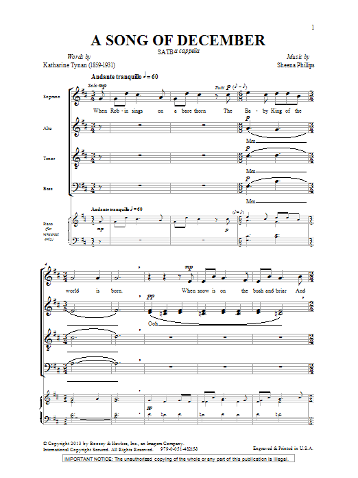 Download or print Sheena Phillips A Song Of December sheet music, chords and digital score arranged for SATB Choir. This Classical score includes 13 page(s).