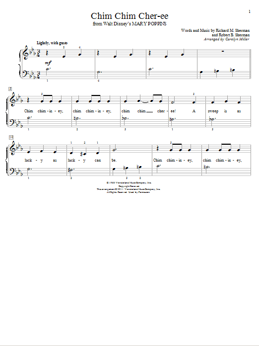 Download or print Dick Van Dyke Chim Chim Cher-ee (from Mary Poppins) (arr. Carolyn Miller) sheet music, chords and digital score arranged for Educational Piano. This Children score includes 3 page(s).