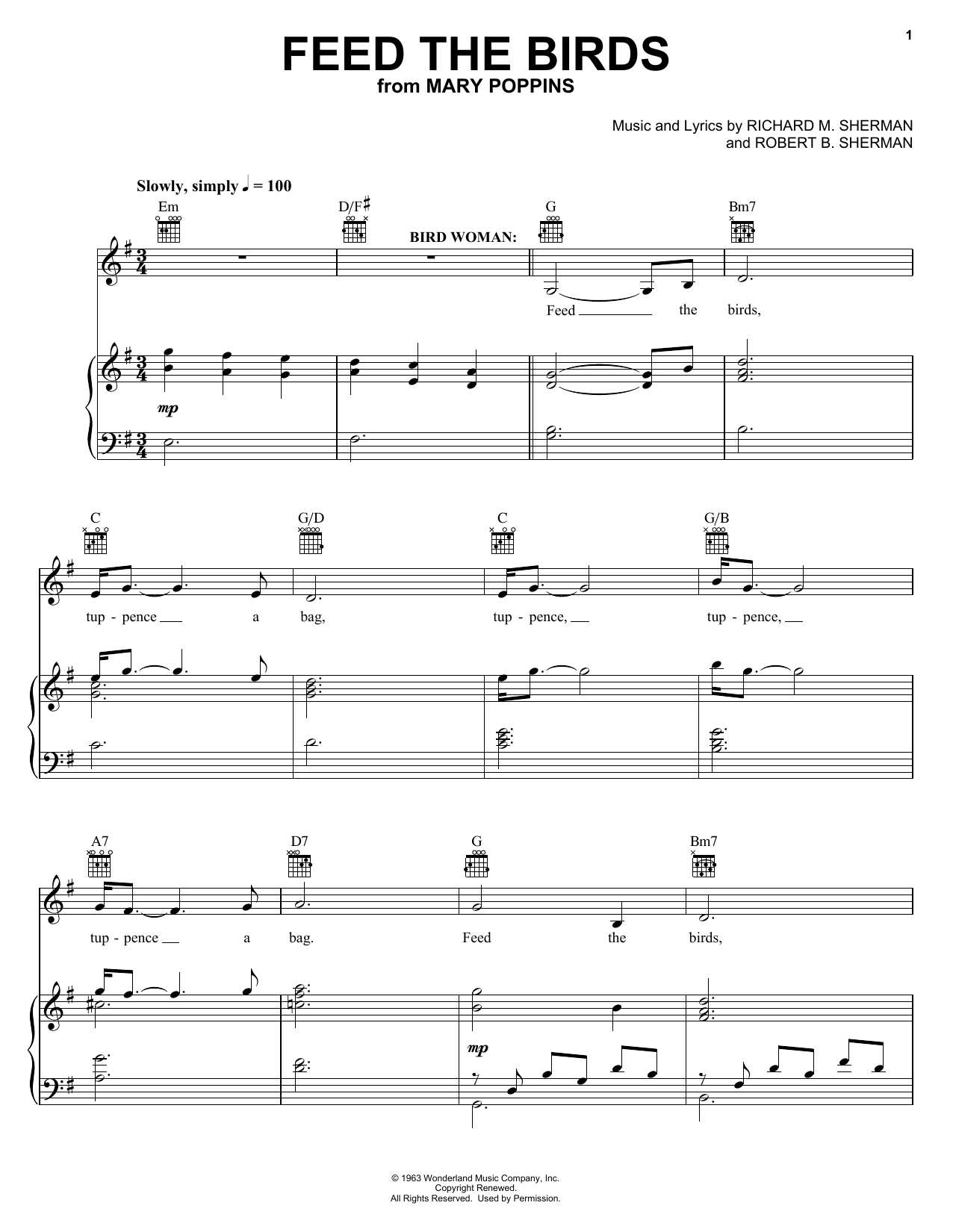 Download or print Sherman Brothers Feed The Birds (Tuppence A Bag) (from Mary Poppins: The Musical) sheet music, chords and digital score arranged for Piano & Vocal. This Children score includes 7 page(s).