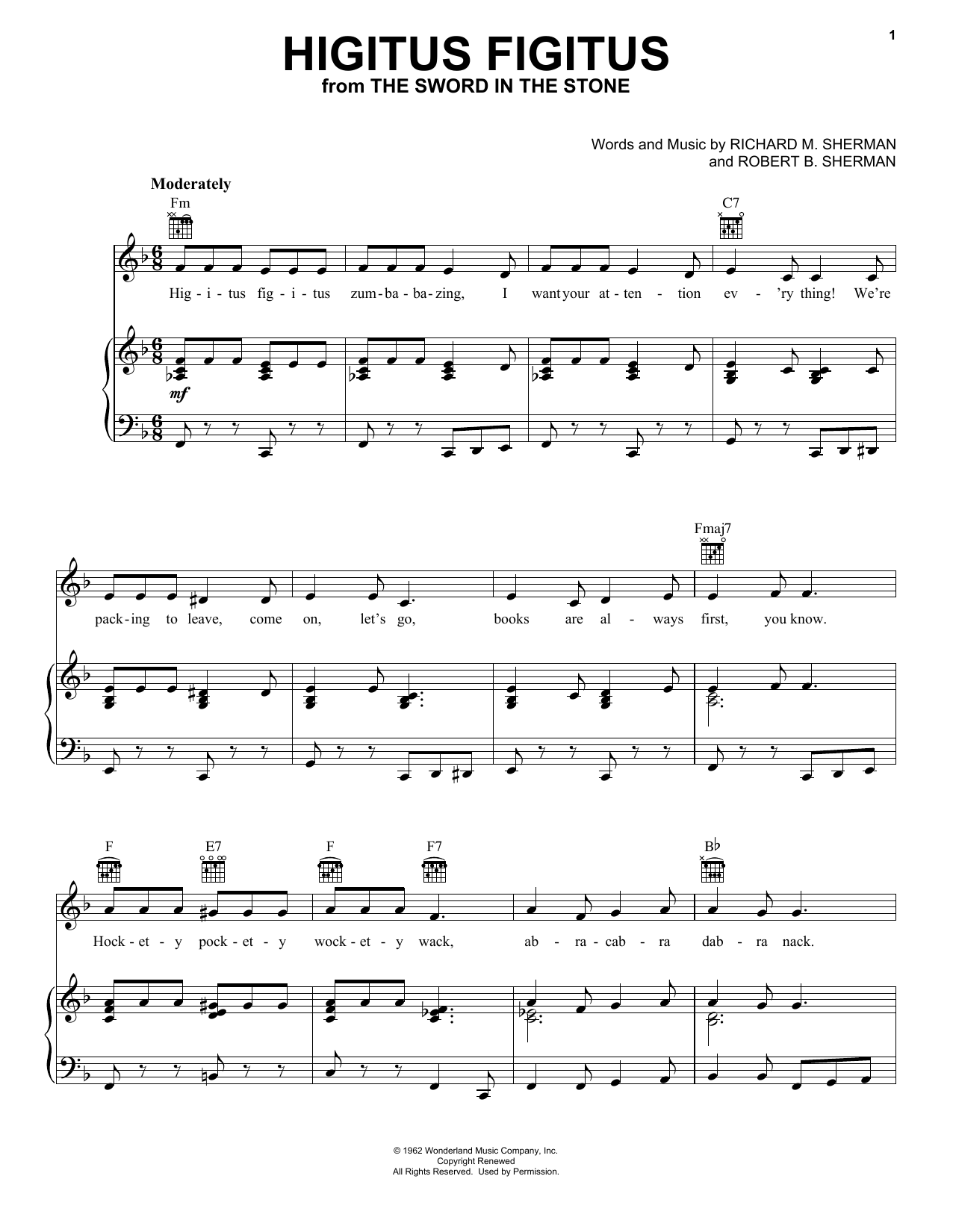 Download or print Sherman Brothers Higitus Figitus (from The Sword In The Stone) sheet music, chords and digital score arranged for Piano, Vocal & Guitar Chords (Right-Hand Melody). This Children score includes 4 page(s).