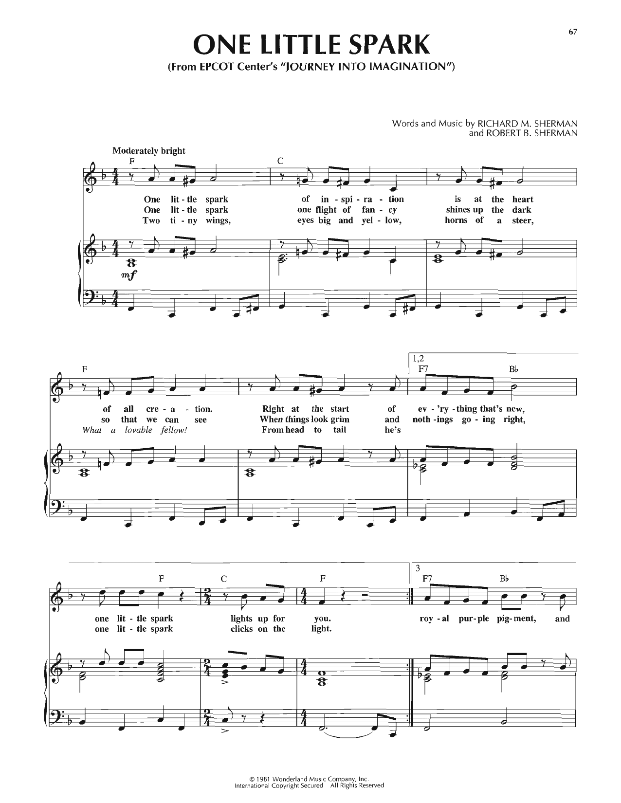 Download or print Sherman Brothers One Little Spark sheet music, chords and digital score arranged for Piano, Vocal & Guitar Chords (Right-Hand Melody). This Children score includes 3 page(s).