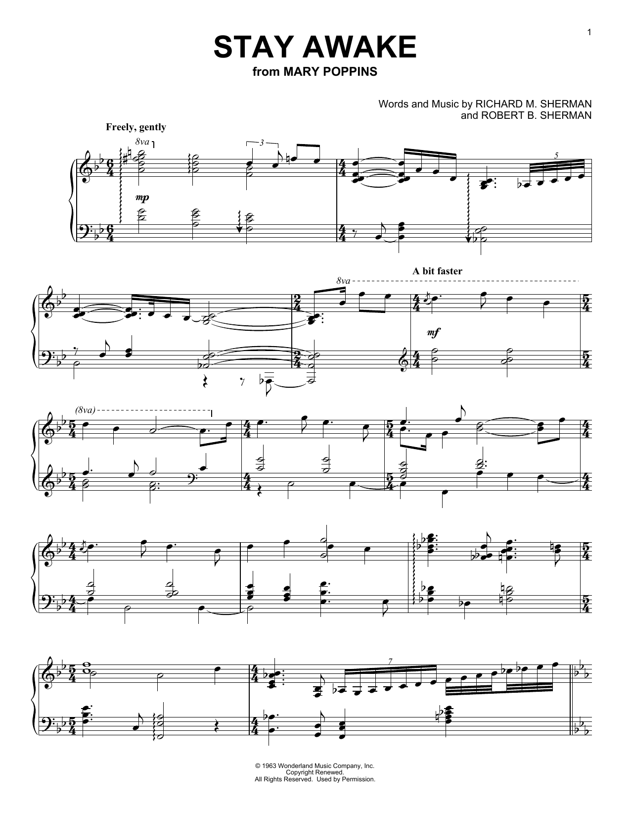 Download or print Sherman Brothers Stay Awake (from Mary Poppins) sheet music, chords and digital score arranged for Piano, Vocal & Guitar Chords (Right-Hand Melody). This Children score includes 3 page(s).