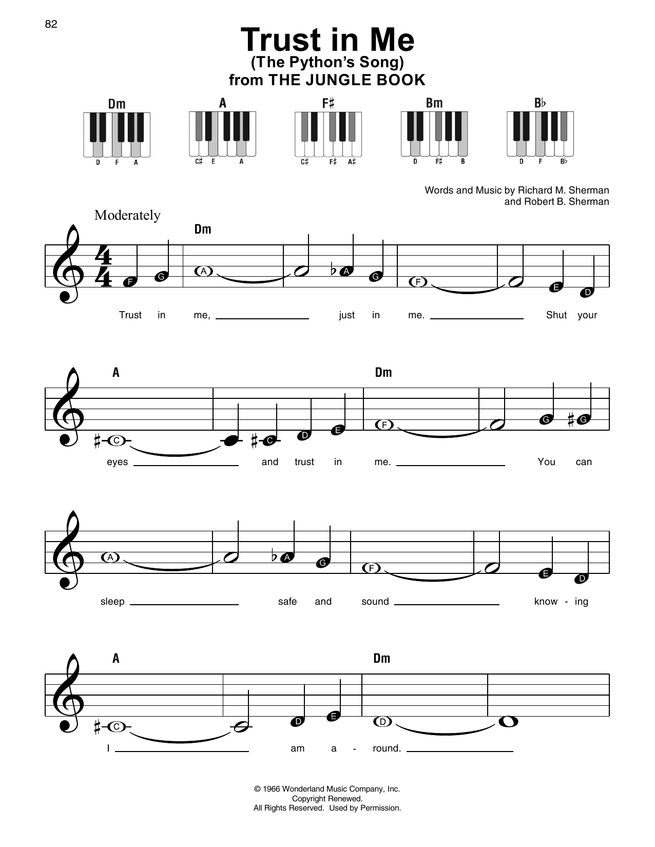 Download or print Sherman Brothers Trust In Me (The Python's Song) (from The Jungle Book) sheet music, chords and digital score arranged for Super Easy Piano. This Disney score includes 2 page(s).