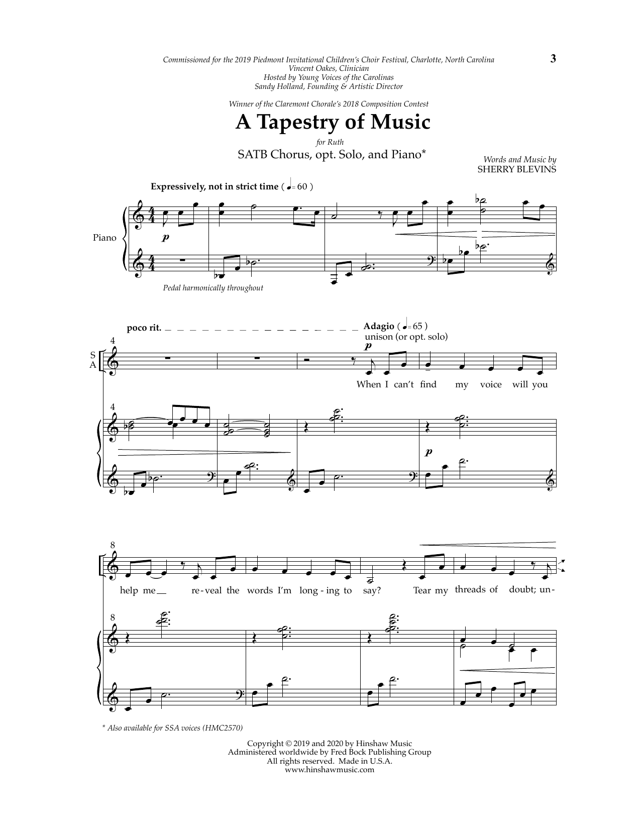 Download or print Sherry Blevins A Tapestry of Music sheet music, chords and digital score arranged for SAB Choir. This Concert score includes 15 page(s).