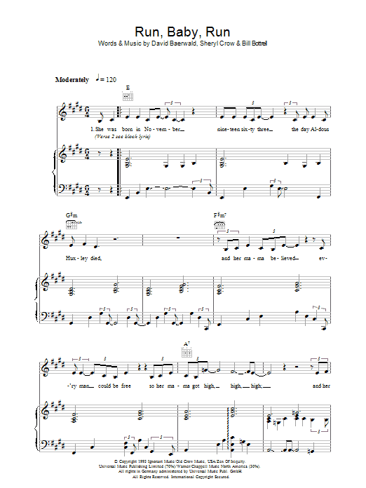 Download or print Sheryl Crow Run, Baby, Run sheet music, chords and digital score arranged for Piano, Vocal & Guitar Chords (Right-Hand Melody). This Pop score includes 4 page(s).