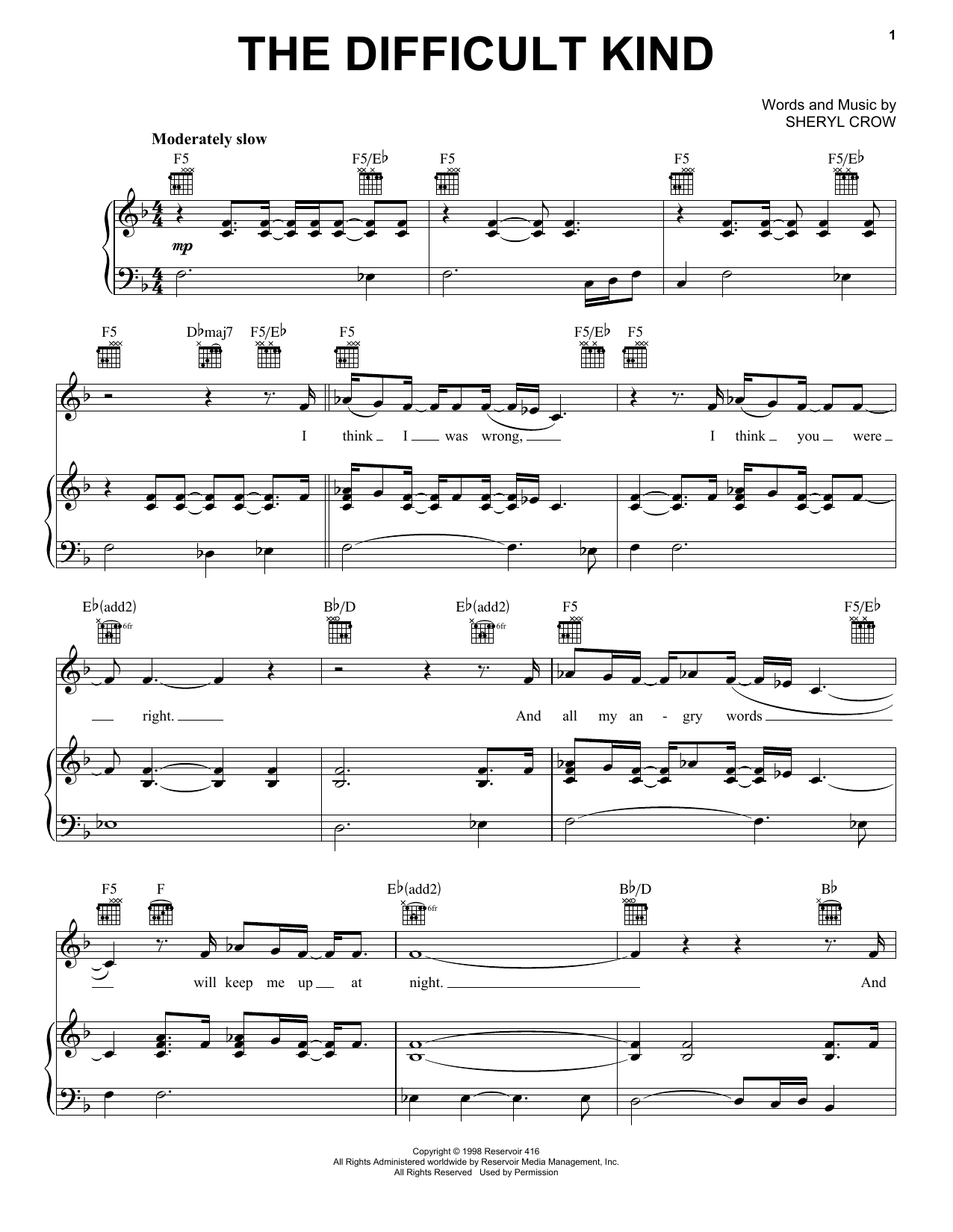 Download or print Sheryl Crow The Difficult Kind sheet music, chords and digital score arranged for Piano, Vocal & Guitar Chords (Right-Hand Melody). This Pop score includes 7 page(s).
