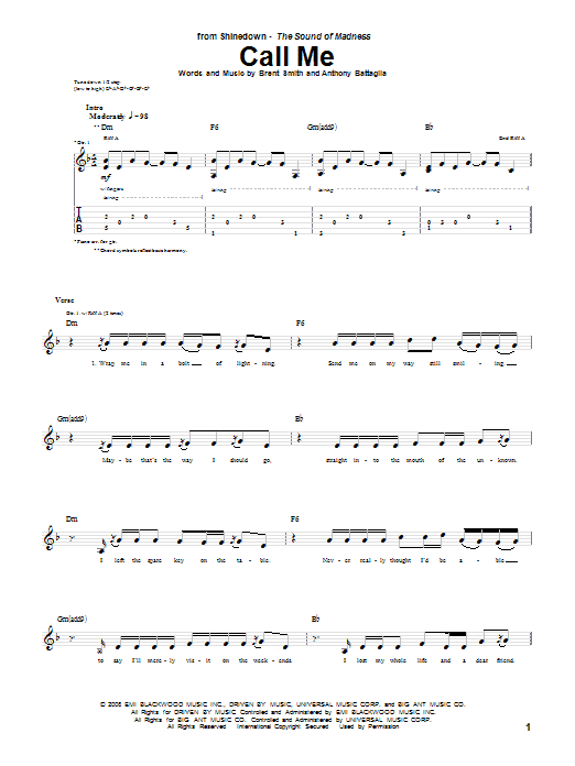 Download or print Shinedown Call Me sheet music, chords and digital score arranged for Guitar Tab. This Metal score includes 5 page(s).
