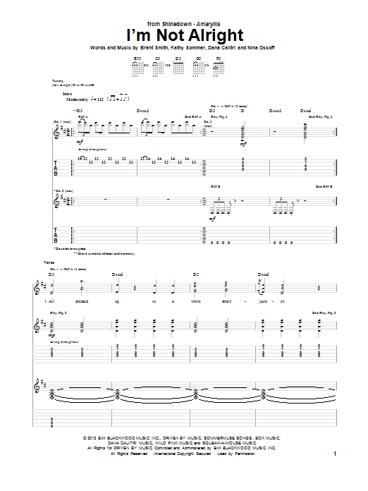 Download or print Shinedown I'm Not Alright sheet music, chords and digital score arranged for Guitar Tab. This Pop score includes 7 page(s).