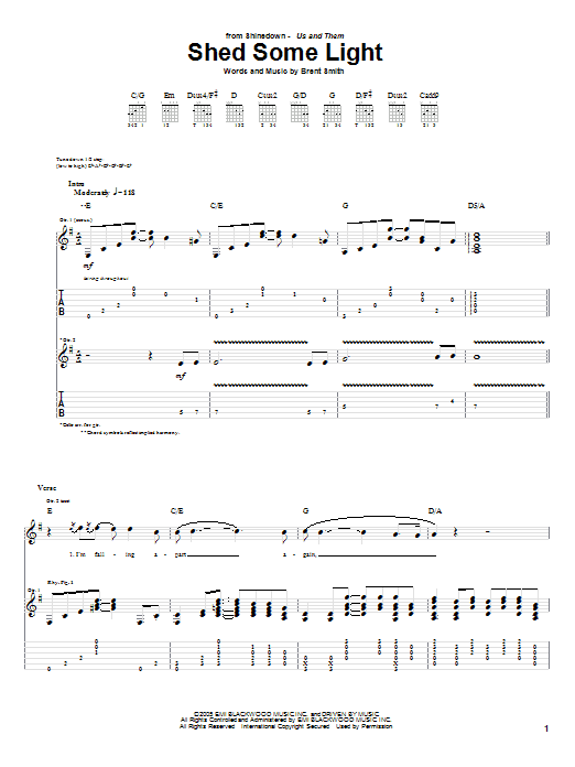 Download or print Shinedown Shed Some Light sheet music, chords and digital score arranged for Guitar Tab. This Metal score includes 8 page(s).