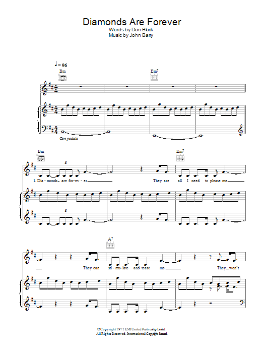 Download or print Shirley Bassey Diamonds Are Forever sheet music, chords and digital score arranged for Piano, Vocal & Guitar Chords. This Film/TV score includes 4 page(s).