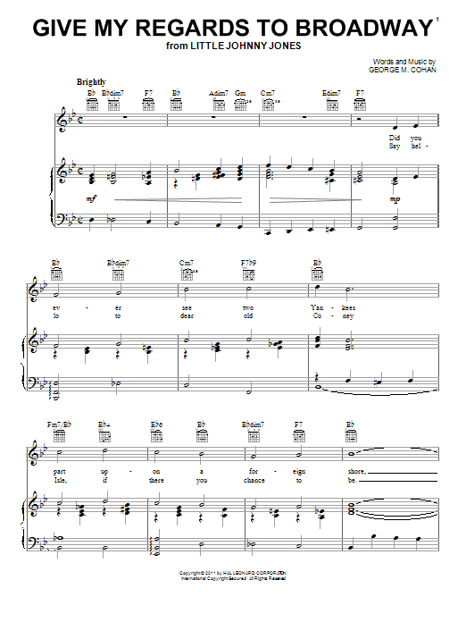 Download or print Showtune Give My Regards To Broadway sheet music, chords and digital score arranged for Piano, Vocal & Guitar Chords (Right-Hand Melody). This Musical/Show score includes 5 page(s).