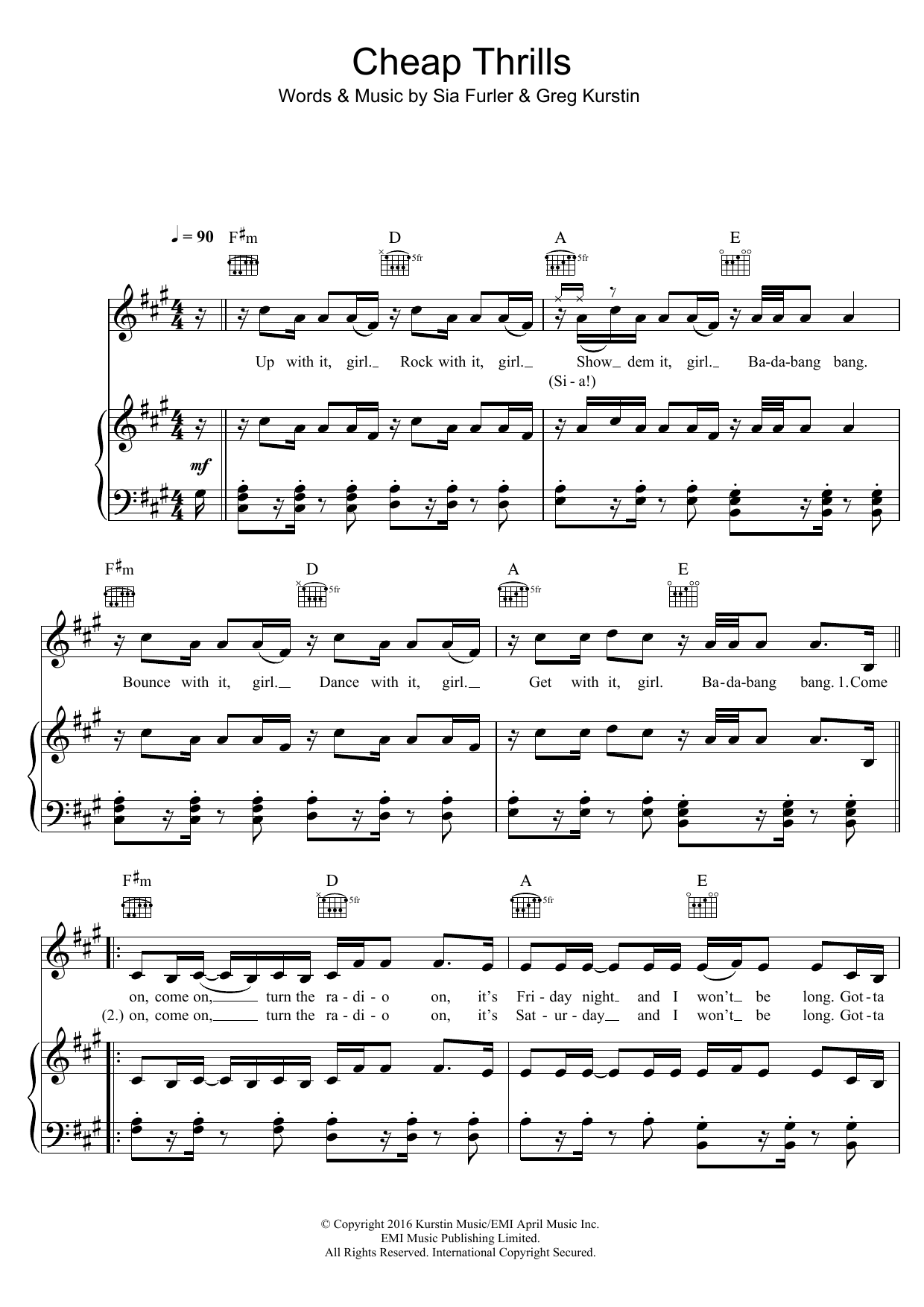 Download or print Sia Cheap Thrills sheet music, chords and digital score arranged for Piano, Vocal & Guitar Chords. This Pop score includes 6 page(s).