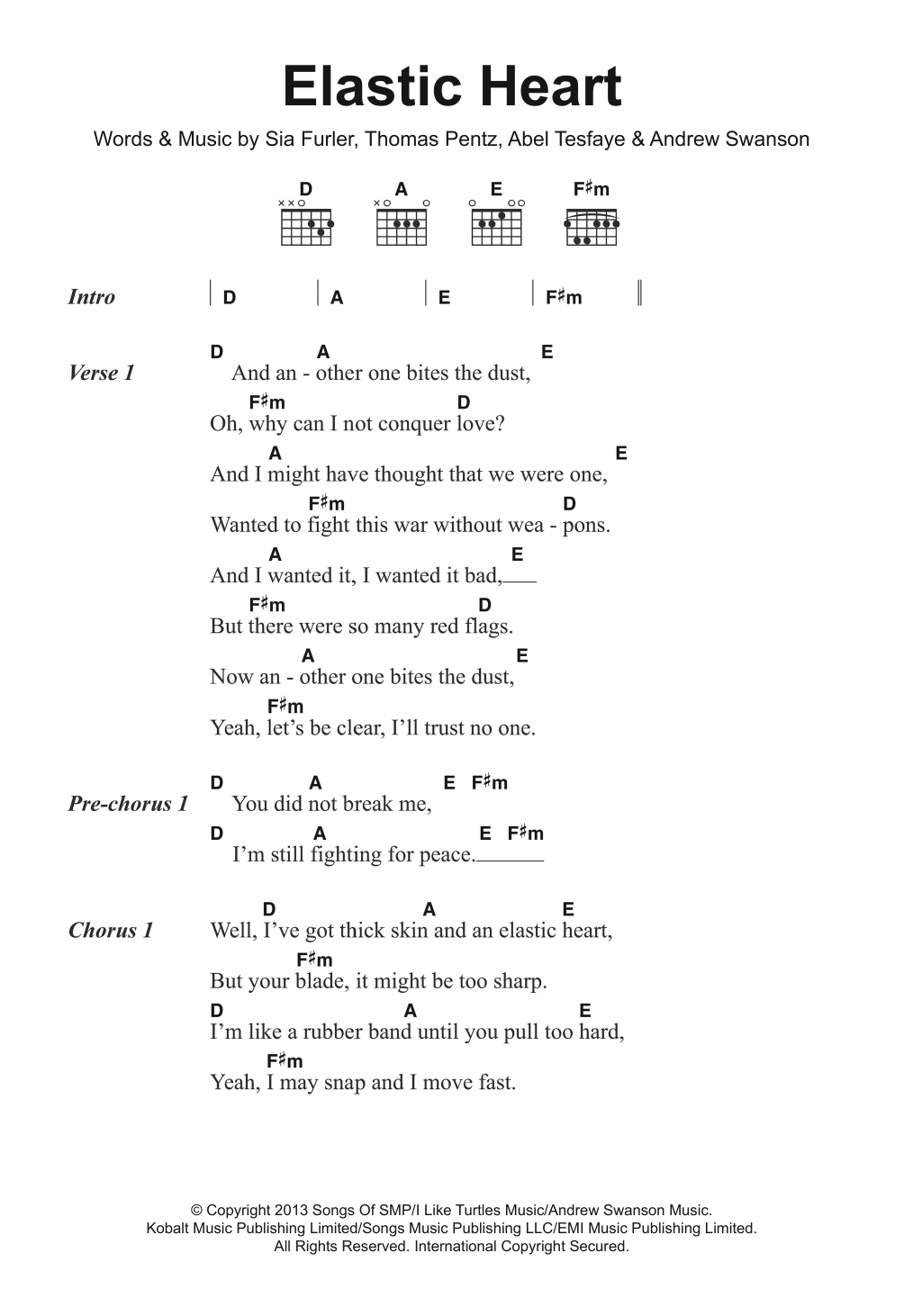 Download or print Sia Elastic Heart sheet music, chords and digital score arranged for Piano, Vocal & Guitar Chords. This Pop score includes 2 page(s).