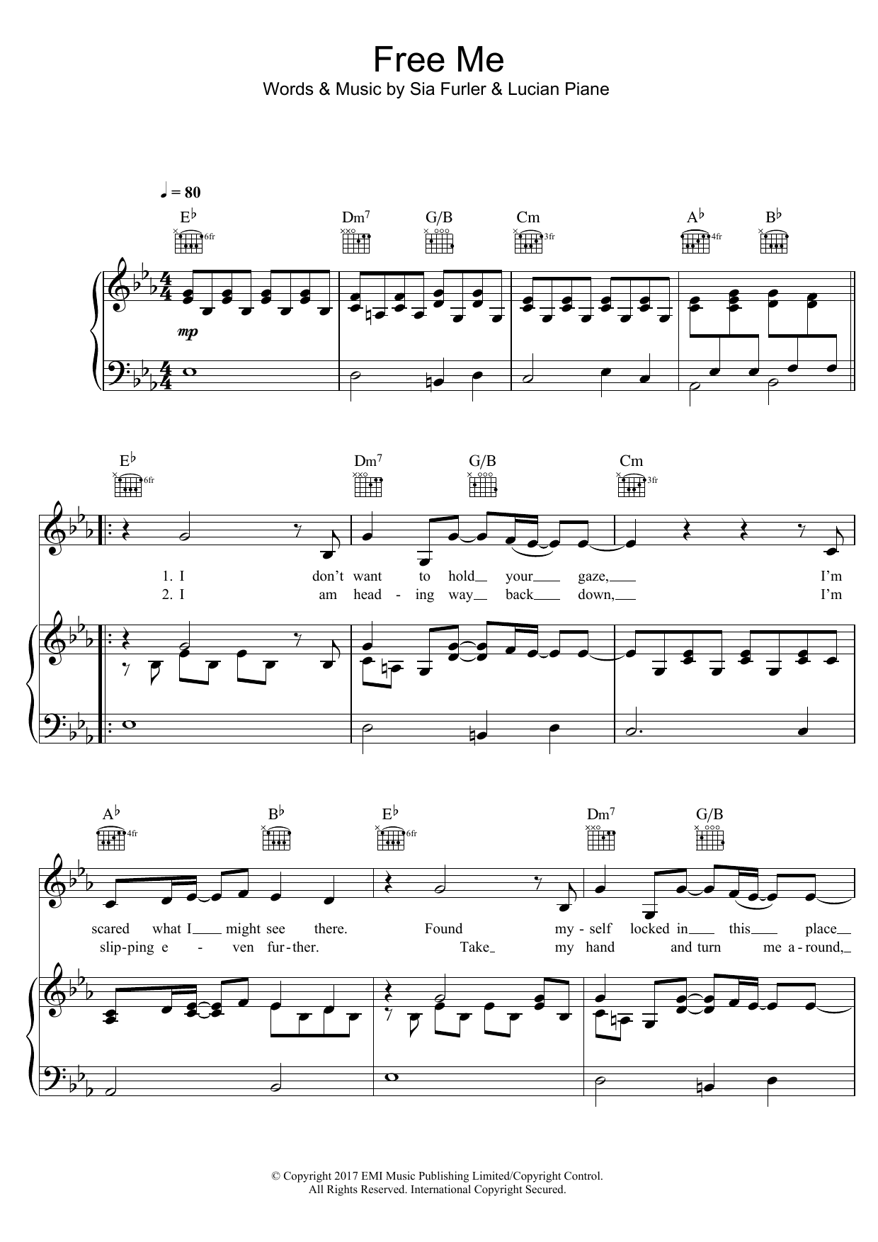 Download or print Sia Free Me sheet music, chords and digital score arranged for Piano, Vocal & Guitar Chords. This Love score includes 7 page(s).