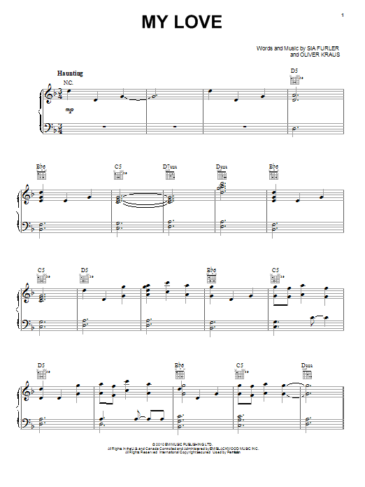 Download or print Sia My Love sheet music, chords and digital score arranged for Piano, Vocal & Guitar Chords (Right-Hand Melody). This Pop score includes 6 page(s).
