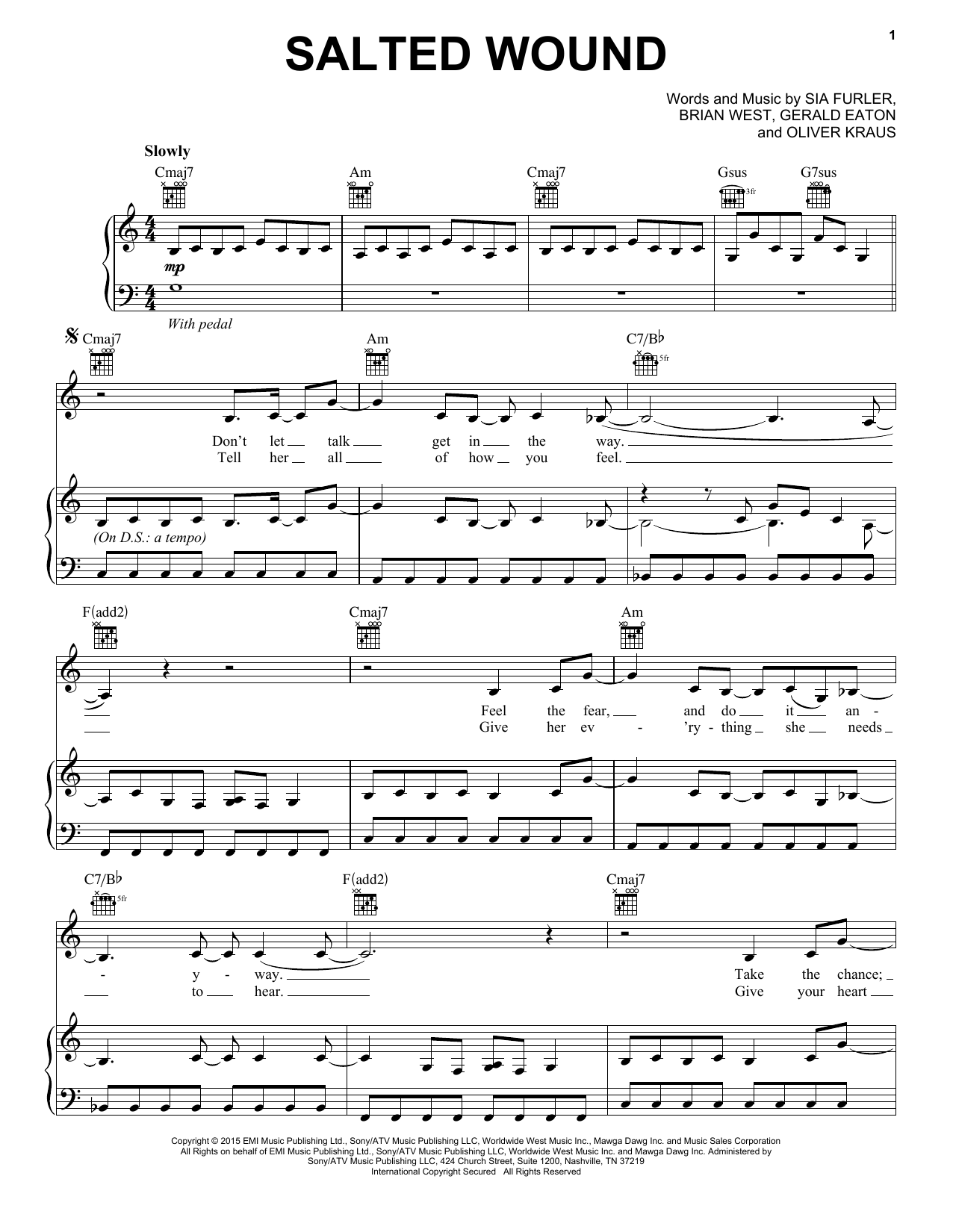 Download or print Sia Salted Wound sheet music, chords and digital score arranged for Piano, Vocal & Guitar Chords (Right-Hand Melody). This Film/TV score includes 4 page(s).