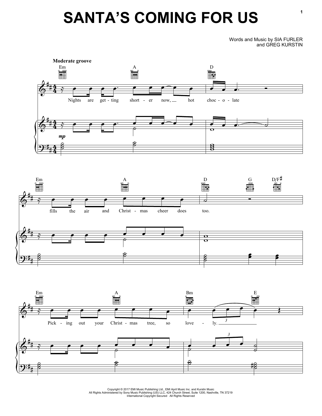 Download or print Sia Santa's Coming For Us sheet music, chords and digital score arranged for Piano, Vocal & Guitar Chords (Right-Hand Melody). This Christmas score includes 6 page(s).