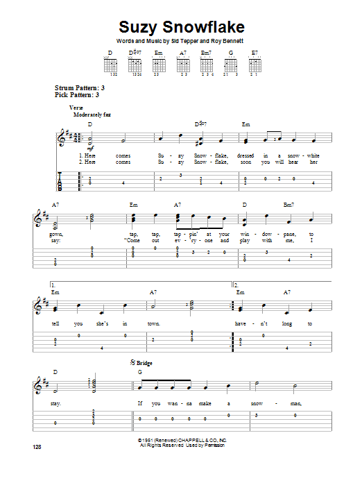 Download or print Sid Tepper Suzy Snowflake sheet music, chords and digital score arranged for Easy Guitar Tab. This Christmas score includes 2 page(s).