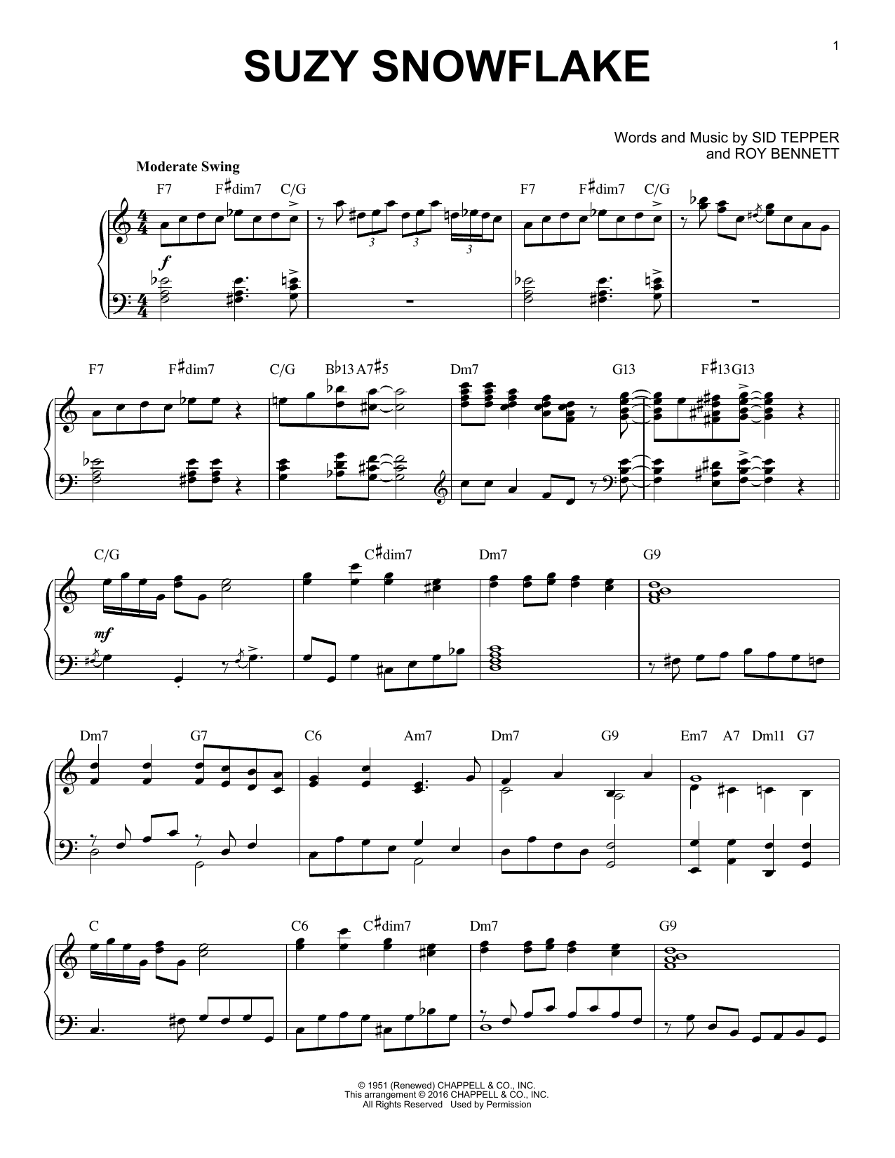 Download or print Sid Tepper Suzy Snowflake [Jazz version] (arr. Brent Edstrom) sheet music, chords and digital score arranged for Piano Solo. This Christmas score includes 3 page(s).