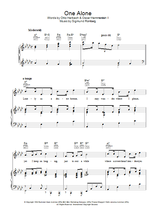 Download or print Sigmund Romberg One Alone sheet music, chords and digital score arranged for Piano, Vocal & Guitar Chords. This Standards score includes 3 page(s).