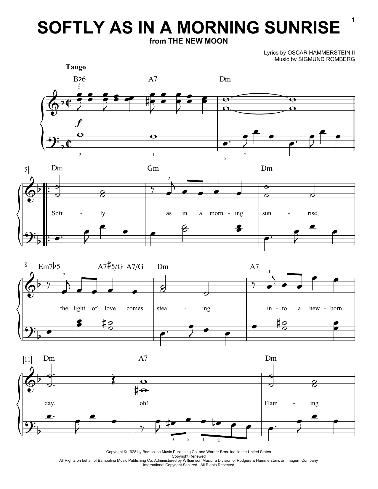 Download or print Sigmund Romberg Softly As In A Morning Sunrise sheet music, chords and digital score arranged for Real Book – Melody & Chords – C Instruments. This Jazz score includes 1 page(s).