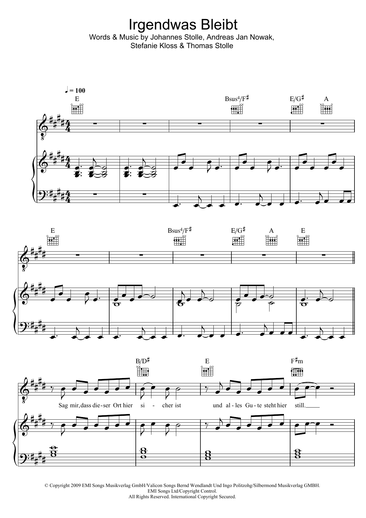 Download or print Silbermond Irgendwas Bleibt sheet music, chords and digital score arranged for Piano, Vocal & Guitar Chords. This Pop score includes 5 page(s).