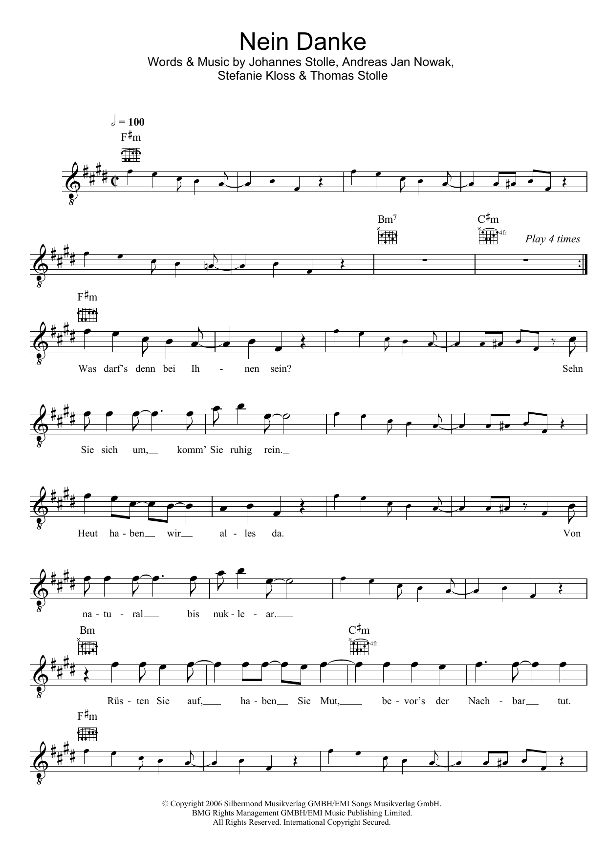 Download or print Silbermond Nein Danke sheet music, chords and digital score arranged for Lead Sheet / Fake Book. This Pop score includes 4 page(s).