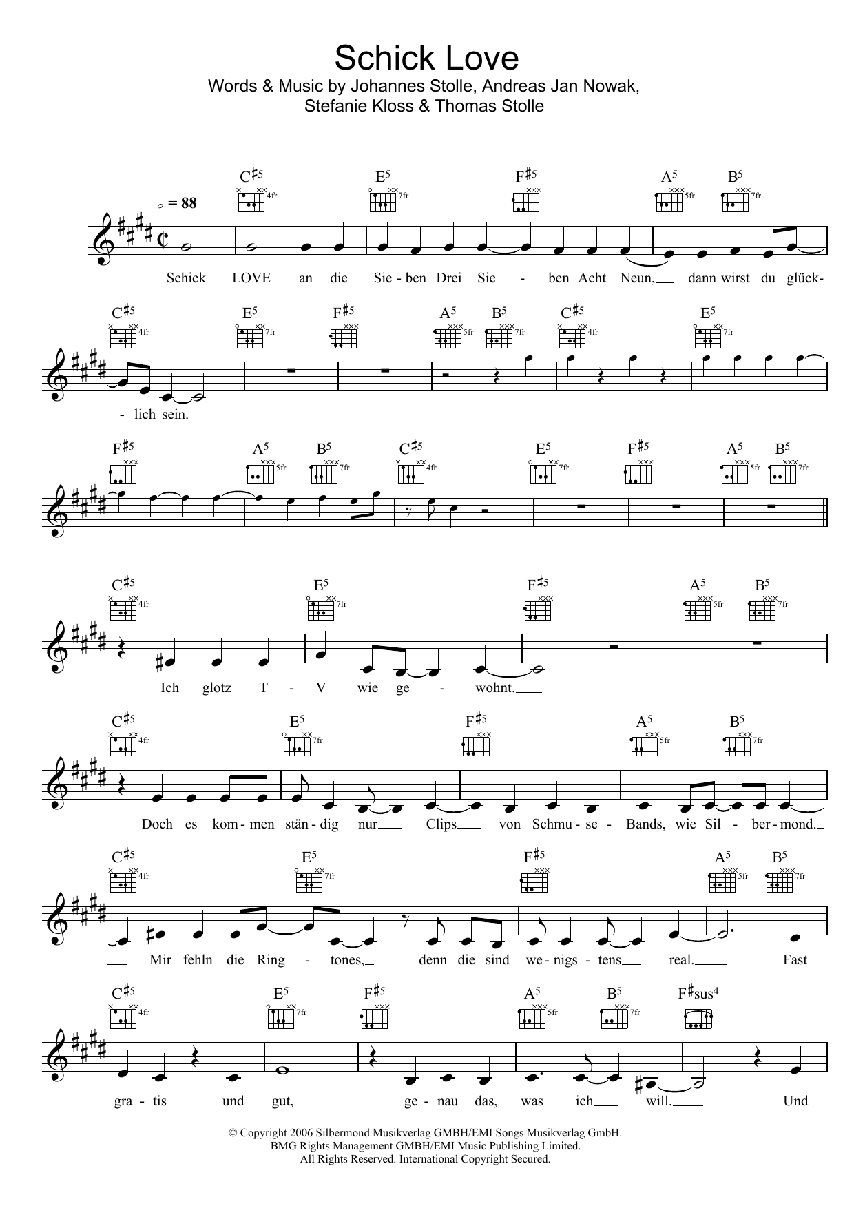 Download or print Silbermond Schick Love sheet music, chords and digital score arranged for Lead Sheet / Fake Book. This Pop score includes 4 page(s).