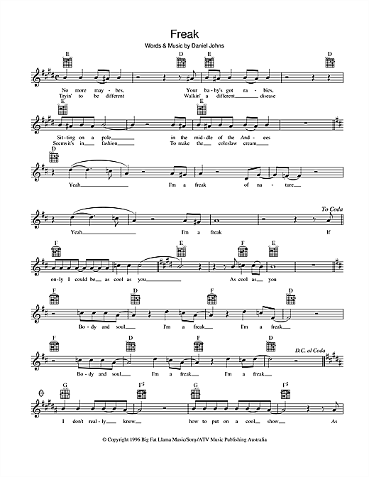 Download or print Silverchair Freak sheet music, chords and digital score arranged for Piano, Vocal & Guitar Chords (Right-Hand Melody). This Rock score includes 6 page(s).