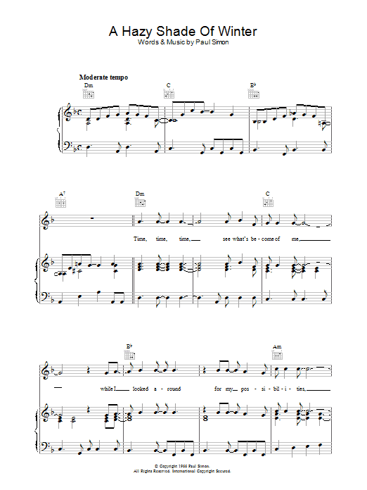 Download or print Simon & Garfunkel A Hazy Shade Of Winter sheet music, chords and digital score arranged for Piano Chords/Lyrics. This Folk score includes 2 page(s).