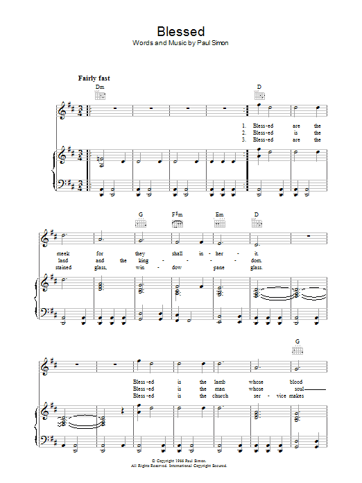 Download or print Simon & Garfunkel Blessed sheet music, chords and digital score arranged for Piano, Vocal & Guitar Chords. This Folk score includes 5 page(s).