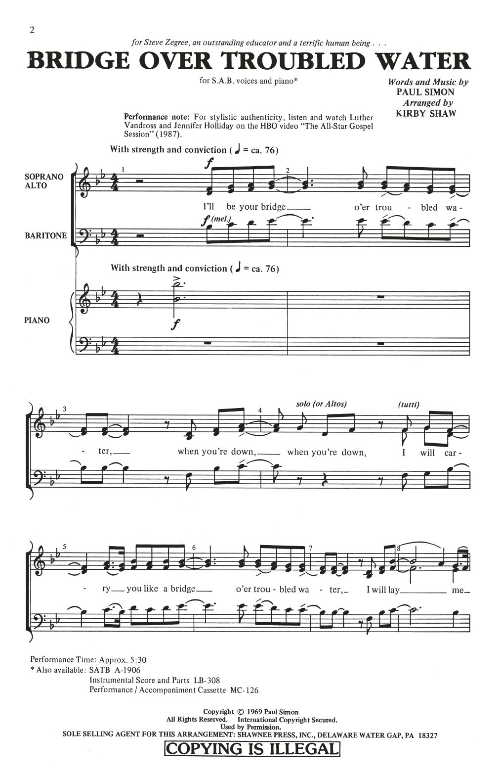 Download or print Simon & Garfunkel Bridge Over Troubled Water (arr. Kirby Shaw) sheet music, chords and digital score arranged for SAB Choir. This Standards score includes 11 page(s).