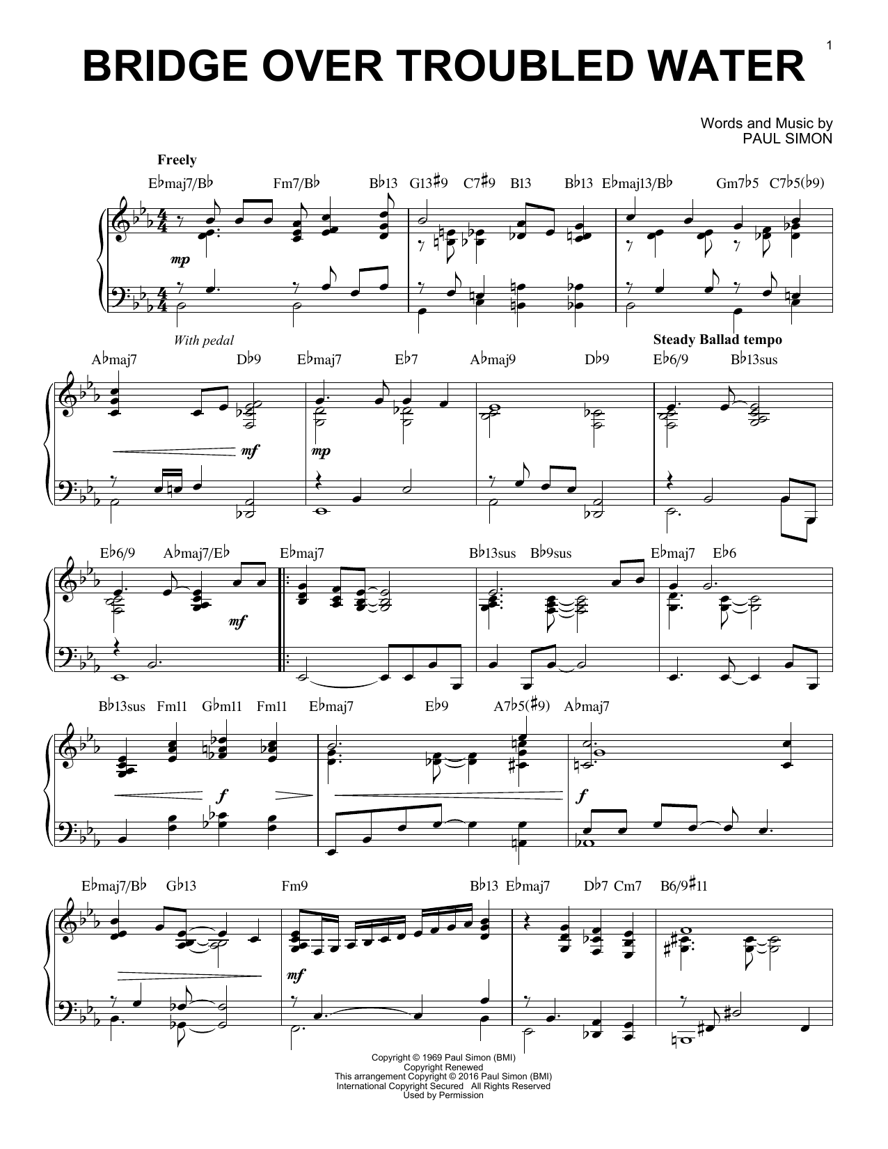 Download or print Simon & Garfunkel Bridge Over Troubled Water [Jazz version] (arr. Brent Edstrom) sheet music, chords and digital score arranged for Piano & Vocal. This Jazz score includes 6 page(s).