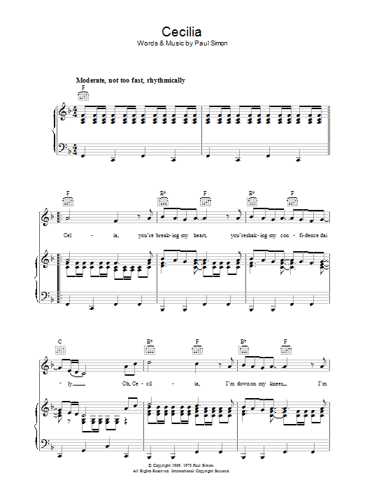Download or print Simon & Garfunkel Cecilia sheet music, chords and digital score arranged for Piano, Vocal & Guitar Chords (Right-Hand Melody). This Pop score includes 4 page(s).