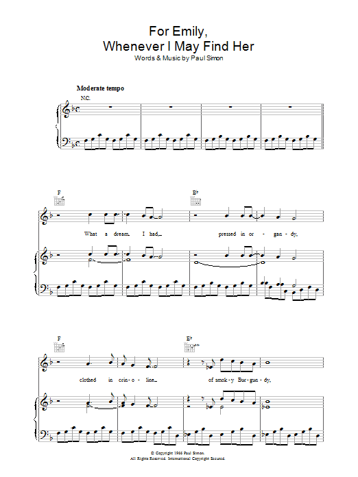 Download or print Simon & Garfunkel For Emily, Whenever I May Find Her sheet music, chords and digital score arranged for Piano, Vocal & Guitar Chords. This Folk score includes 5 page(s).